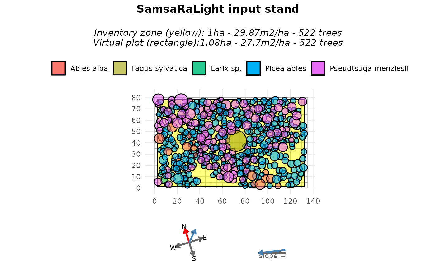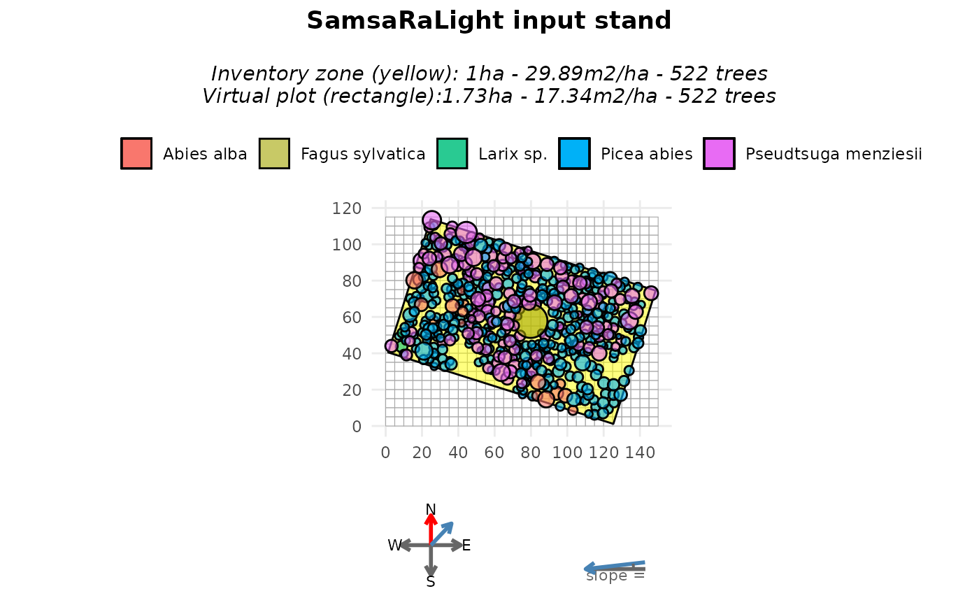 As we can see, rotating the stand results in a rectangular inventory zone (shown in yellow) that may not cover the entire virtual stand area. This creates empty spaces around the borders of the virtual stand and reduces the total basal area per hectare (due to a larger area with the same number of trees). This could slightly bias the light computation, even though the small empty areas on the borders could be negligible for tree light interception. This can also be avoided by: