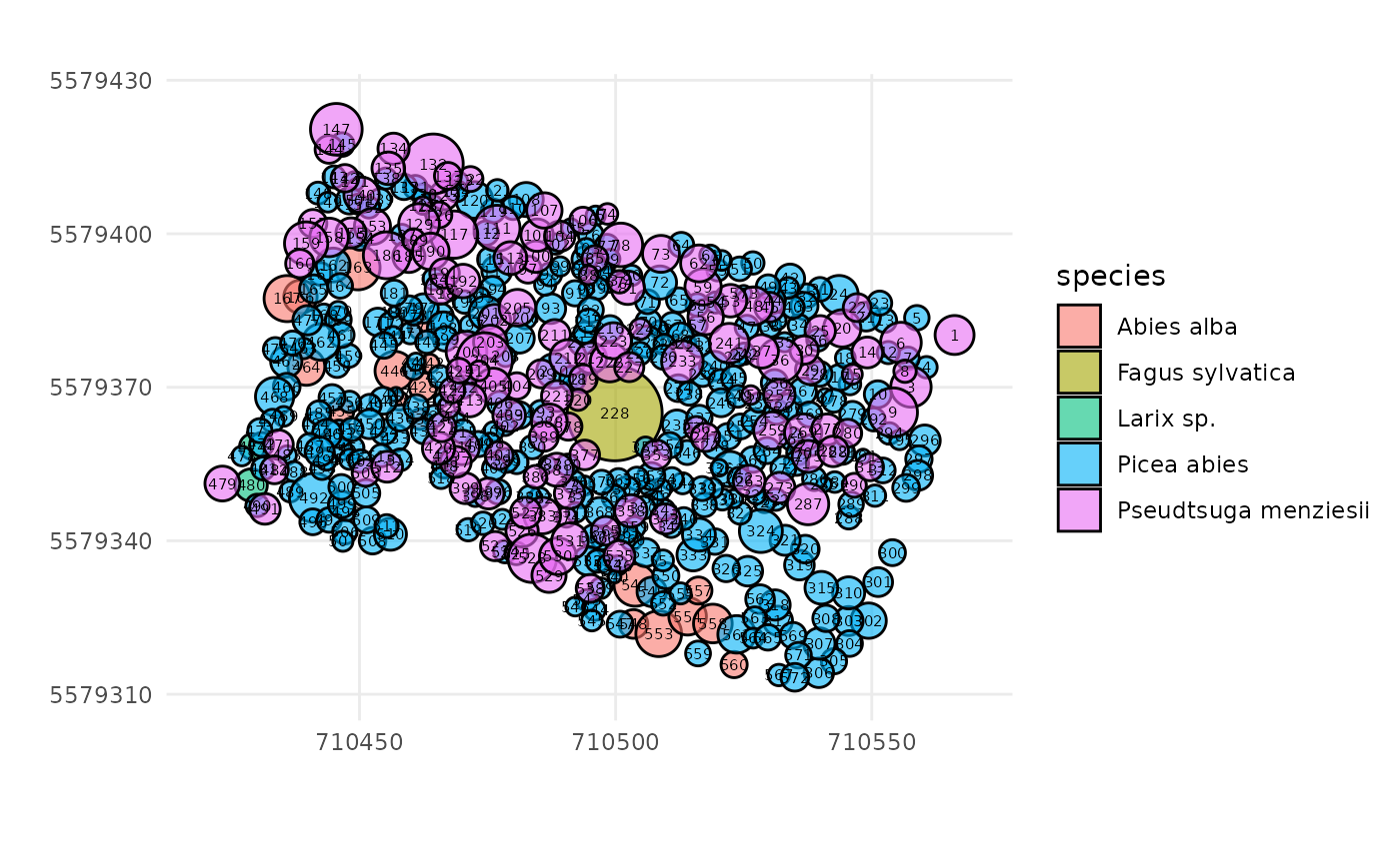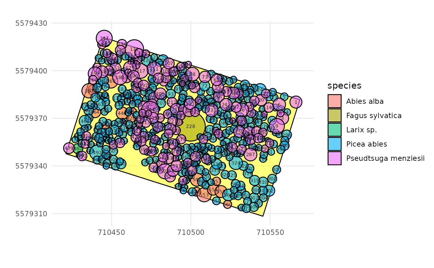 #> $ epsg: num 32631After this conversion, tree positions are expressed in meters and the inventory can now be validated and visualized correctly.