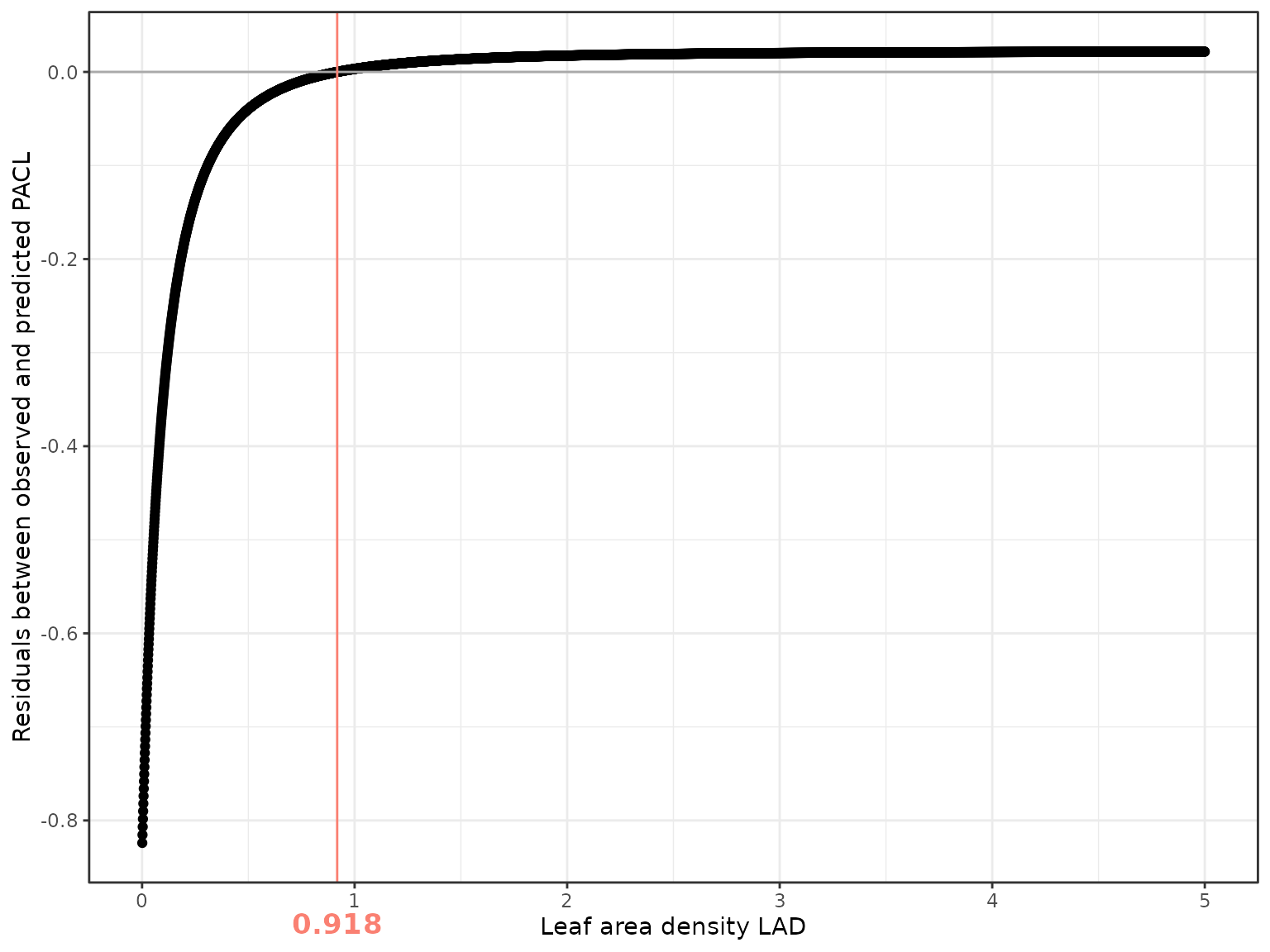 In this example, the optimal LAD is 0.918, confirming that we underestimated LAD value, but showing that 0.5 was quite low for this site.