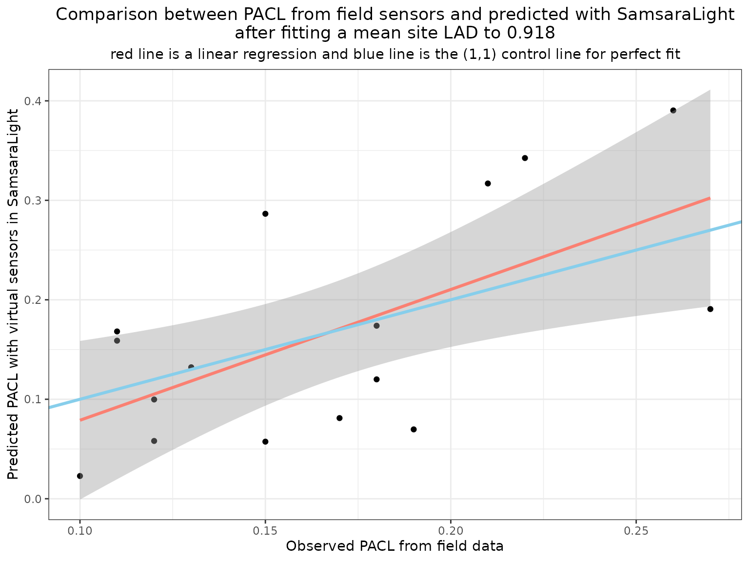 labs(title = paste0("Comparison between PACL from field sensors and predicted with SamsaraLight\nafter fitting a mean site LAD to ", best_lad),